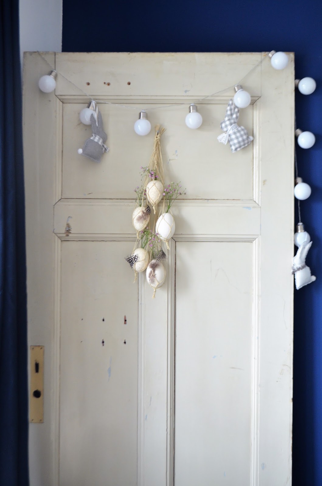 Wer mir auf Instagram folgt, weiß um unsere Tür im Wohnzimmer. Die ist selbst nur zur Deko da, wird aber auch gern in die Gesamtdeko miteingebunden. So liegt es nahe, dass die simplen Eiernetze dort ihren Platz gefunden haben.