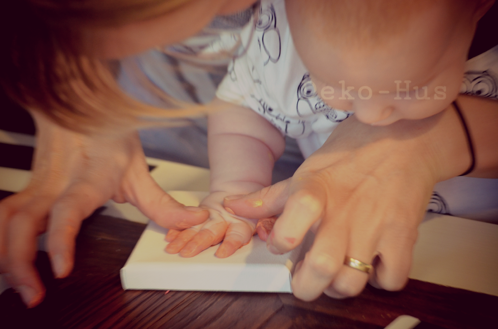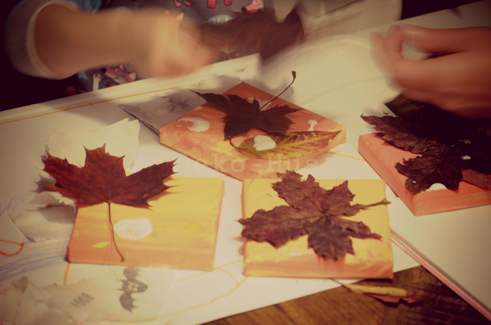 Erst die Keilrahmen anmalen und trocknen lassen. Dann die Hebstschätze drauf kleben. Wir haben noch ein paar Handabdrücke gemacht, so haben wir eine jähliche Erinnerung an die Sammelleidenschaft nicht, dass wir schon genug Beweise dafür hätten.