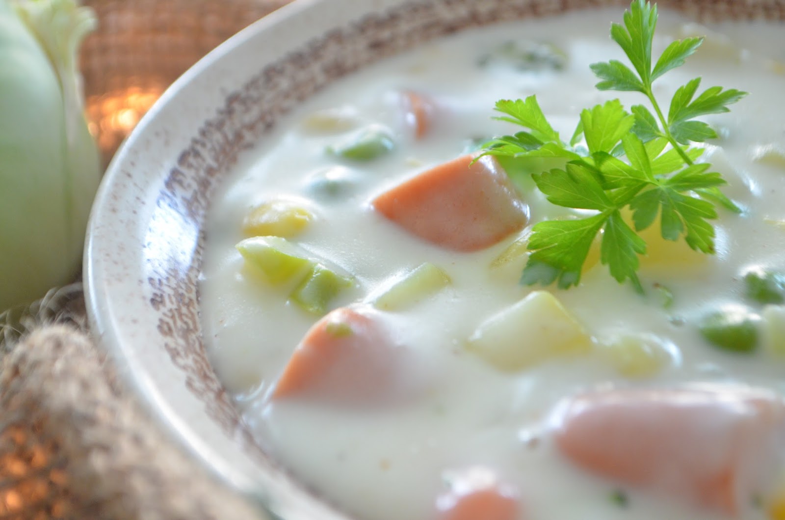 Kohlrabi, Mais und Würstchen hinzugefügt. Die dürfen im Eintopf nicht fehlen!