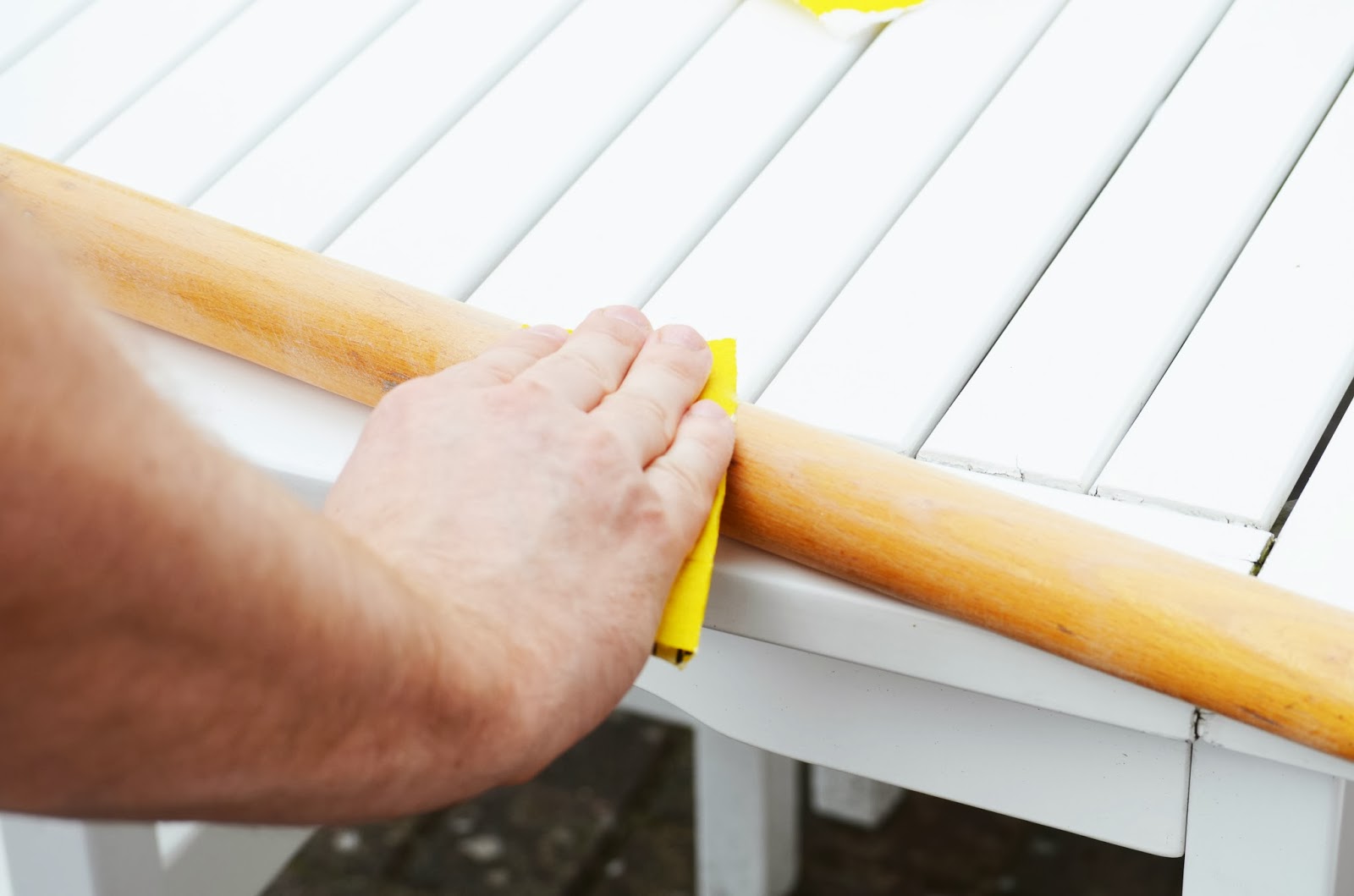 Den alten Klarlack abschleifen.Wenn Ihr keine Staublunge kriegen wollt, macht Ihr es am Besten draussen.