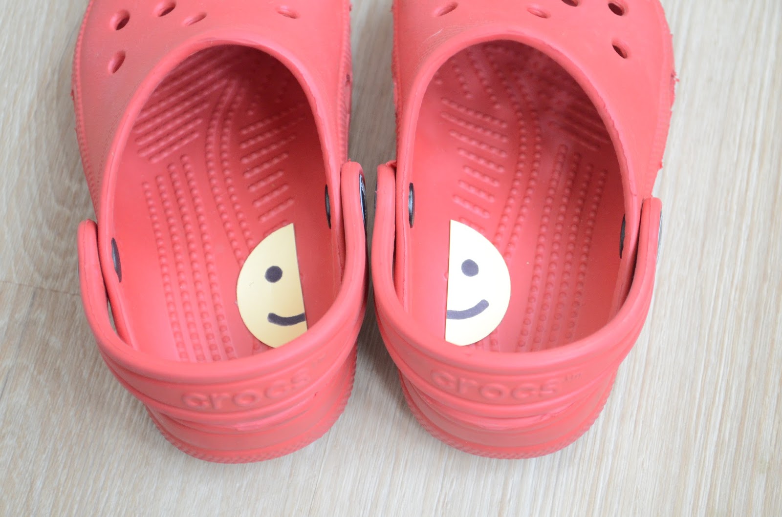 Nimmt einen Kreis (ich habe diesen ausgesstanzt), Farbe am besten anders als die Innensohle des Schuhs, malt einen Smiley drauf.