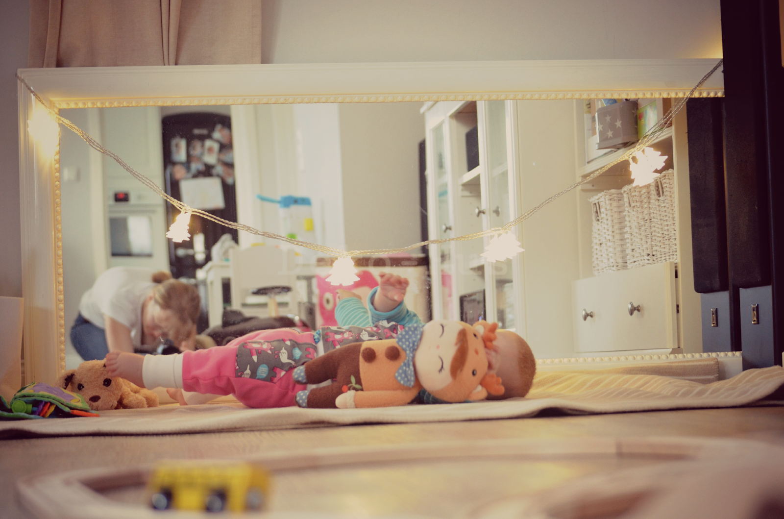 Unser Spiegel liegt auf dem Boden und Nea findet es großartig. Sie berührt ihn, versucht ihn abzulecken und durch die Lichterkette ist er nochmal doppelt so spannend!
